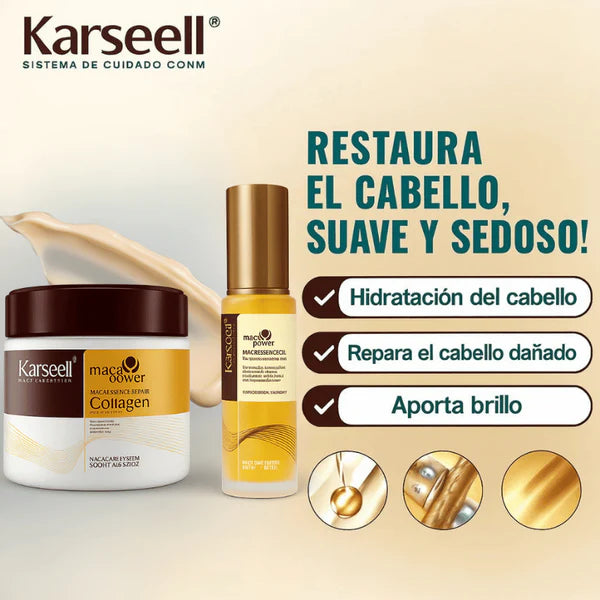 A diferencia de las mascarillas convencionales, Karseell combina colágeno hidrolizado y extracto natural de macadamia, una fórmula profesional que penetra profundamente en la fibra capilar.